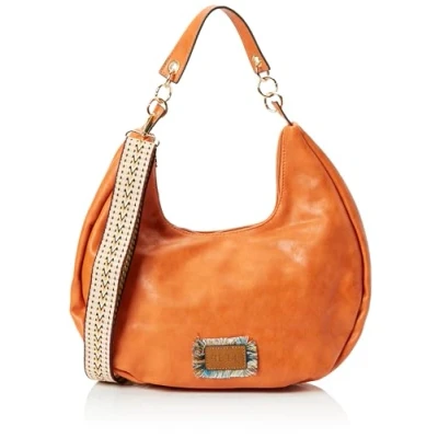 Faux leather shoulder bag Logo plate with colourful fringes Rounded shape Removable shoulder strap with pattern Inner compartment made of textile