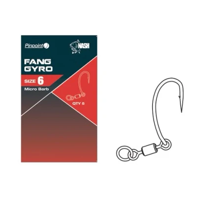 Nash Fang Gyro - Carp hooks - Available in multiple hook sizes - Micro barbed or barbless - 5 hooks per pack - Made from superior carbon steel alloy - Features micro ring swivel for ultimate hook rotation - Superior hooking with 360’s and Ronnie rigs - No additional components required - Watch the video The Nash Fang Gyro range uses the latest in carbon steel alloy technologies, Carbide 617, resulting in hooks that are up to 50% stronger yet lighter than the already familiar Nash hooks. Strong designs and razor sharp hooks is what you should expect – the sharpest out there!