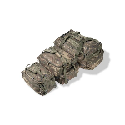 Nash Subterfuge Duffel Bag - Rucksack and carryall in one - Available in multiple sizes - Flat front pocket with zipper - Easy access - Three-sided twin top-zip main compartment - Internal mesh pocket with zipper for valuables - Side handles for easy loading and unloading - Sturdy, waterproof base that is easy to clean - Two side end pockets, fitting Subterfuge pouch systems The Nash Subterfuge Duffel Bag is a versatile and robust rucksack and carryall in one, available in multiple sizes, offering both convenience and durability. It features a flat front pocket with a zipper for quick access, a three-sided opening twin top-zip main compartment, and an internal mesh pocket with a zipper for valuables. Handy side handles make loading and unloading easy, while the sturdy, waterproof base is easy to clean. Two additional side end pockets are designed to house Subterfuge pouch systems, making this bag ideal for organized storage of carp gear.