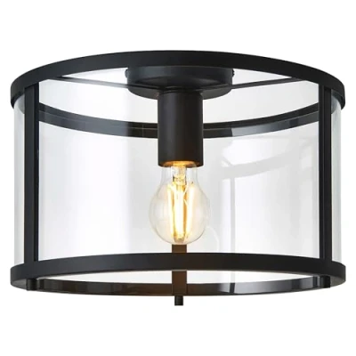Modern Simplicity: Featuring a circular frame in matte black/antique brass and clear glass panels, this flush mount ceiling light introduces a refined industrial look that suits both traditional and contemporary interiors with subtle style. Compact Design: With a low 215mm projection, this flush light fitting fixture is ideal for rooms with limited ceiling height, offering bright downward lighting without compromising headspace or visual openness in smaller areas. LED Compatible: Designed for use with an E27 bulb of up to 10W, this flush light supports energy-efficient LED lamp options, offering a practical lighting solution that balances brightness and energy savings with ease of use. Dimmable Ceiling Light Function: When paired with a compatible dimmer switch, you can easily adjust the light intensity to set the right mood, whether you prefer soft evening lighting or a brighter daytime ambience. Durable Finish: Crafted from metal with a matt black/antique brass coating and enclosed clear glass drum, this hallway light resists wear and discolouration while maintaining a clean, timeless appearance through everyday use.