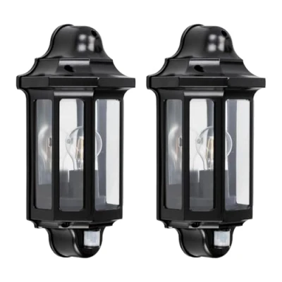 National Lighting Black Outdoor Security Lights PIR External Wall Light Motion Sensor Presence Detector Half Lantern Garden Porch Lamp IP44 Rated 60W GLS ES or LED E27 (Not Included) 2 Pack