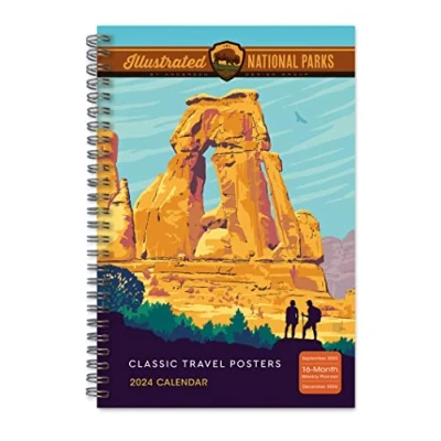 The new illustrated National Parks weekly planner is designed to conjure up nostalgia and celebrate our American heritage Convenient size 6" x 9" for desk or travel September 2023 - December 2024 Planner, featuring 16 months of weekly and monthly pages for easy planning, planning, overview calendar reference pages, a note section for important reminders, projects, and long term planning Weekly view pages provide ample lined writing space for easy organization and more detailed planning, allowing you to keep track of your meetings, appointments, tasks, tasks, notes, to do lists, reminders, ideas, shopping lists, and meal plan menus Printed on high quality paper, premium quality, durable spiral bound cover allows calendar to open flat. Front and rear jacket flaps with storage pockets, good for storing notes and ensuring durability. Back with perforated page marker. Includes 16 months calendar spreads, year overview and reference calendar.