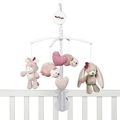 Mobile with adorable friends Nina, Jade and Lili, Plays soothing lullaby "La-Le-Lu" so your child gently falls asleep and has sweet dreams Ideal for developing sight and hearing: figures turn and dance in rhythm, Attaches to crib or cradle Quality assurance: Ultra-soft cotton and polyester material, Soft and supple: stimulates the sense of touch Easy care: removable figurines, machine washable at 30 °C Contents: 1 x Nattou Musical Mobile with Plush Toys, Collection: Nina, Jade and Lili, Material: 100 percent polyester, Dimensions: 37 x 31 x 9 cm, Colours: Beige-Pink-White, 987240