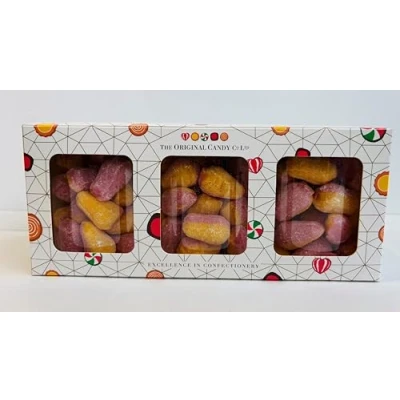 Classic pear-flavored vegan sweets Three 220g jars for sharing or indulging Soft, chewy, and full of fruity flavor Vibrant jars brighten up any candy table A fun and nostalgic gift for all ages