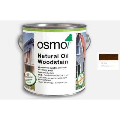 General description Osmo Natural Oil Woodstain in Teak is an innovative and durable protective finish that serves as both a base and top coat. It is designed for exterior wood surfaces, allowing the natural wood grain to remain visible while providing excellent weather and UV resistance. This woodstain is highly water and dirt resistant, and it effectively reduces wood swelling and shrinkage. Its microporous, breathable finish prevents cracking, peeling, or flaking, and no sanding is necessary for future applications. Technical specifications Volume: 125ml Coverage: 26m²/L with one coat Drying time: First coat: 4-6 hours; Second coat: 12 hours Moisture content of wood: max. 20% Installation Ensure the wood surface is clean, dry, and frost-free before application. Stir well before use and do not thin. If possible, apply the first coat to all sides of the wood before installation. For application, use an Osmo Flat Brush or Microfibre Roller, applying thinly along the wood grain. Allow