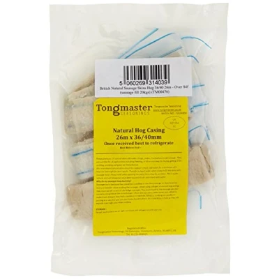 High quality, British, natural sausage skins, an essential for making professional sausages. Please note: these casings will measure the full length when taken off the plastic tape! Perfect for home use, or for catering and business use. 5m of casings will use around 4-5kg sausage meat, use this as a guide if you’re not sure how much casings you need. Supplied salted to ensure freshness, simply re-salt and keep in an airtight container in the fridge after use to keep them fresh. Soak the casings overnight in cold water, drain and soak in lukewarm water for a further 30 minutes before use. Simply slide the casing on to your nozzle using the plastic tape as a guide, remove the plastic tape and fill!