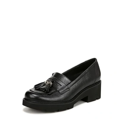 Oxford-inspired lug sole loafer for women with our modern Naturalizer infinity logo wrapped around tassel Synthetic or leather upper responsibly sourced from Leather Working Group certified tanneries and a closed round toe, 3/4 inch platform, 2 1/4 inch block heel. Contour+ Comfort technology for a premium fit and all-day comfort experience. Linings, insole, insole board, toe box and heel counter crafted from partially recycled materials. Women's slip on platform loafers with flexible and lightweight EVA lug sole. Consciously packaged: 100% of our shoe boxes are made of 80% recycled paper + soy-based ink