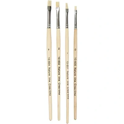 Flat hog-hair bristle brush with wooden handle Ideal for use with heavy-bodied paints Pack includes 4 brushes in sizes 00, 1, 2, and 4 Length: 18.5-19 cm, Width: 5-7 mm Perfect for artists and crafters