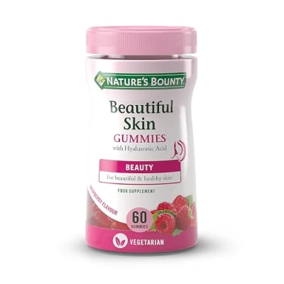 HYALURONIC ACID SKIN SUPPLEMENTS with VITAMIN E: Provides 100mg of vegetarian hyaluronic acid in every two skin gummies, with delicious raspberry flavour. Hyaluronic Acid is a clear, lubricating substance found naturally in moisture-rich tissues such as the skin, eyes and joints. FULL SPECTRUM OF VITAMINS FOR SKIN: In addition to hyaluronic acid, the Beautiful Skin Gummies include skin care nutrients such as zinc, biotin, vitamin C, and vitamin E. PROTECTION FROM OXIDATIVE STRESS: Excessive sun exposure, smoking, alcohol consumption and a high-sugar diet can all accelerate oxidative stress. That’s why our Beautiful Skin Gummies with vitamin C and Zinc support your skin from within. QUALITY, POWER, POTENCY: Nature’s Bounty is committed to safety and excellence in all our supplements. Beautiful Skin Gummies have no preservatives, starch, wheat, yeast extract, or fish. They’re vegetarian-friendly and contain no artificial flavours or sweeteners. FROM THE TRUSTED WELLNESS EXPERTS: Nature’s Bounty Beautiful Skin Gummies are a product of our dedication to quality, consistency, and scientific research.