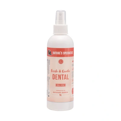 Nature's Specialties Fresh & Gentle Dental Spray Keep those teeth clean and healthy. Fight bad breath and maintain healthy gums with this refreshing mint scented oral spray that is the perfect finisher to any groom. Use in conjunction with veterinary dental care for a clean and healthy mouth. Please note: use of oral spray should not be considered as a substitute for sound veterinary dental treatment. Ingredients Deionised water, Emulsifier, Natural Flavouring, Alcohol