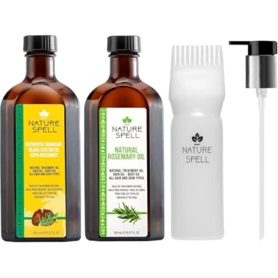 TARGETED HAIR GROWTH & HYDRATION: Nature Spell Rosemary Oil, pre-diluted with almond, stimulates follicles for longer, stronger hair while deeply hydrating strands in a lightweight, non-greasy blend STRENGTHEN & PROTECT: The power duo of Rosemary Oil and Jamaican Black Castor Oil not only promotes hair growth but also repairs damage, strengthening strands and shielding against breakage VERSATILE CARE FOR ALL HAIR TYPES: Whether using rosemary oil for hair growth or castor oil for nourishment, this set caters to all hair types, enhancing shine, resilience, and overall scalp health EASY APPLICATION METHODS: Use the Hair Oil Pump for direct scalp application or the Hair Applicator Bottle Comb for precise distribution, ensuring effortless integration into your haircare routine MADE IN THE UK: Here at Nature Spell, we extract Earth’s natural goodness to create spellbinding products you won't want to live without. We are a 100% cruelty-free brand
