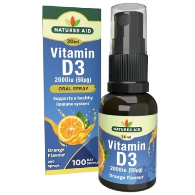 Natures Aid Vitamin D3 Spray is a convenient and tasty alternative to tablets. Just 2 sprays gives you a high strength dose of 2000iu (1000%NRV) 100 days supply in each pack Suitable for vegetarians and contains no artificial colours or flavours.