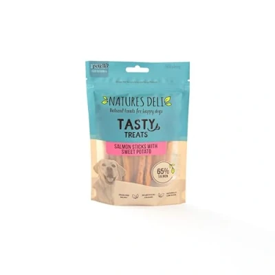 NUTRITIOUS DOG TREAT: Made with 65% Salmon and Sweet Potato SOFT AND CHEWY TEXTURE: Ideal for dogs of all sizes and ages, including puppies and seniors. PROTEIN-PACKED SNACK: High in protein to support muscle development and overall health. NO ARTIFICIAL ADDITIVES: Free from artificial colours, flavours, and preservatives, for a natural and safe reward. PERFECT TRAINING TREAT: Conveniently sized sticks for rewarding good behaviour during training sessions.