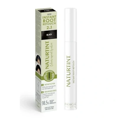 Instant grey coverage AND long-term grey prevention. Naturtint's innovative formula instantly conceals 100% of greys whilst actively reducing the appearance of future grey hairs with regular use. Powered by MelanoGray technology which stimulates natural melanin production to help restore your hair's original colour, helping to slow the reappearance of new greys overtime. Easy, fast & convenient - Precision brush - Residue free - Suitable for eyebrows - Small and lightweight - Perfect for travel - Dermatologically tested - 98.6% Ingredients of natural origin. Four temporary instant root retouch shades available to compliment a multitude of hair colours. Naturtint 2in1 Instant Root Retouch Black works best on hair colour shades 1N and 2N.