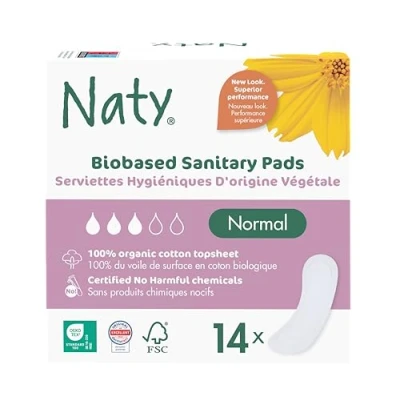 Naty Sanitary Towels Normal Without Wings 100% Certified Organic Cotton top Sheet Skin Safe Period Pads Unscented, 0% Conventional Plastic Absorbent Protection 14