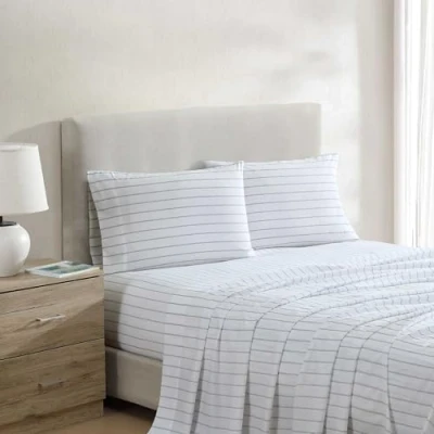 NAUTICA HOME: Sustainably crafted bedding and bath collections inspired by the sea. Our collections combine style and functionality for products that are comfortable, versatile, and ideal for everyday use. QUALITY: Made from 100% cotton percale, this fabric offers a crisp, breathable feel with a smooth matte finish—durable, easy to maintain, and perfect for everyday comfort. EASY CARE: Machine wash warm with like colors, tumble dry low, and remove promptly to maintain the crisp feel and durability of the cotton percale fabric. SET INCLUDES: (1) Fitted Sheet_x0002_80"W X 60"L; (1) Flat Sheet- 102"W X 90"L; (2) Pillowcase- 30"W X 20"L; Elastic band that is on all four sides to ensure a snug fit to all mattress sizes; 15" sheet pocket depth (12" for twin size); Fitted sheet fits mattress up to 18" deep (15" for twin size) CERTIFICATIONS: Oeko-Tex certified, the mark of excellence for products that are healthy for you and healthy for the environment.