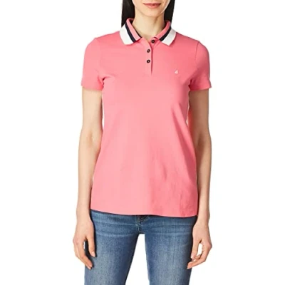 Nautica Women's Classic Fit Striped V Neck Collar Stretch Cotton Polo Shirt, Camellia Rose, X Small