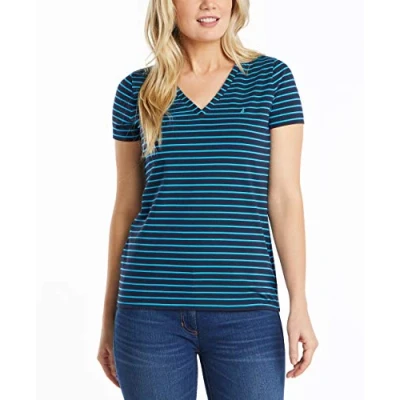 Nautica Women's Easy Comfort V Neck Striped Supersoft Stretch Cotton T Shirt, Bright Blue Jig, M