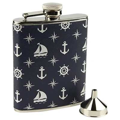 Nautical-style Hip Flask Stainless steel with leatherette patterned outer Come with a tiny funnel for easy filling Height is 13cm Capacity 175ml