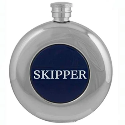 Round hip flask with Skipper Made from stainless steel which won't taint the flavour of your drink Come with a tiny funnel for easy filling Gift boxed Capacity 125ml