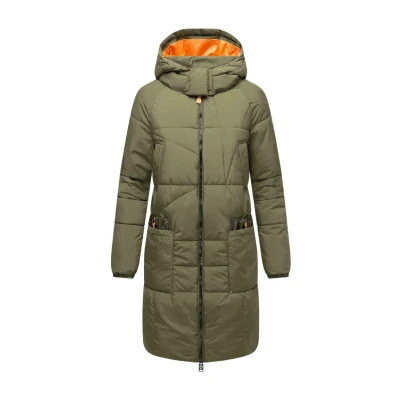 Look: The coat impresses with its modern design, which fits perfectly into urban everyday life. The knee-length design gives it an elegant silhouette, while contrasting details like the striking inner lining add a trendy touch to the look. Material: made of durable material, the quilted coat reliably protects against wind and moisture. The water-repellent properties ensure that you stay dry even in light rain, while the outdoor coat offers a comfortable fit. FIT: The straight fit and the knee-length design offer a timeless elegance that flatters every figure. The high collar and chin guard provide additional protection from cold wind. With the press studs on the hood, the women's coat can be individually adjusted to ensure the best comfort. Details: The outdoor coat is a real space miracle: two inner pockets with zip and a total of eight outer pockets offer plenty of space for all your essentials. Elasticated sleeve ends with internal elastic band and the 2-way zip provide flexibility and practical benefits. This long winter jacket combines functionality with fashionable details. It is perfect for cold, wet days and offers enough storage space for all the necessary utensils. The adjustable hood and the thoughtfully designed pockets make it an indispensable companion in your winter wardrobe.