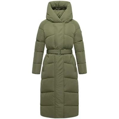 LOOK: Modern quilted coat with a sporty-elegant twist, which can be combined in many ways – whether urban with jeans and boots or as a stylish contrast to feminine outfits. The voluminous hood gives the look a distinctive silhouette. Material: the robust, but soft outer material reliably protects against light moisture thanks to its water-repellent properties. Inside, the pleasantly smooth lining ensures a comfortable feel - ideal for cold days. Perfect for winter daily adventures and longer walks. Fit: the coat reaches to the middle of the calf and stylishly surrounds the figure. With the Velcro waist belt, the silhouette can be individually emphasized. Thanks to the 2-way zip under a press stud placket, the long women's coat guarantees enough freedom of movement. DETAILS: Two fleece-lined outer pockets with press studs provide warm hands, while two inner zip pockets allow secure storage. Elasticated sleeves and hem with an inner elastic band keep you extra warm. With this extra-long women's jacket, functional style shows its best side. The weather-resistant quality, the thoughtful details, and the versatile fit make it the ideal companion for cold winter days – practical for everyday use and fashionable.
