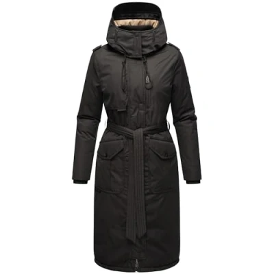 Look: Long winter coat with high collar, practical magnetic flap, soft adjustable hood and modern waist belt from Navahoo - the ideal companion for cold days in autumn and winter MATERIAL: Grippy and wind-resistant outer material, the soft ribbed cuffs at the adjustable sleeve ends and collar, as well as the pleasantly smooth inner lining in the lower part of the jacket and the cuddly soft teddy fleece in the upper part and hood keep you nice and warm Fit: winter parka with figure-flattering cut; for those who like to emphasise their curves: the waist can be adjusted in width with a waist belt; thanks to the slit (with press studs) at the back of the hem, freedom of movement is not restricted despite the length up to the knees DETAILS: Women's winter jacket with high-closing 2-way zip with chin guard keeps you warm even in cold temperatures, the numerous inner and outer pockets provide ample space for all valuables The modern parka combines all the practical functions of an outdoor coat with modern style and can be wonderfully combined with all outfits - a real favourite piece for the cold season!