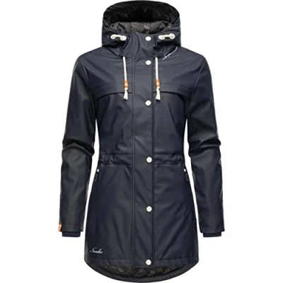 Look: stylish women's raincoat with large hood, rubberised outer material and numerous stylish details from Navahoo Material: The functional coat is waterproof and windproof thanks to welded seams, the soft inner lining made of teddy fur in the upper half of the jacket and pleasantly soft inner lining in the sleeves and in the rest of the jacket keep you nice and warm Fit: hooded jacket with super length up to approx. mid-thigh (longer at the back than the front), thanks to the individually adjustable inner waist drawstring, the functional parka becomes a real figure-flatterer Details: the fleece-lined outer pockets with waterproof zips and the rubberised hood extension, numerous inner pockets offer plenty of storage space and the 2-way zip offers great freedom of movement This warm women's jacket is a real all-rounder for wet, cold days in the transitional period (spring and autumn) - a fashionable style for all outdoor activities