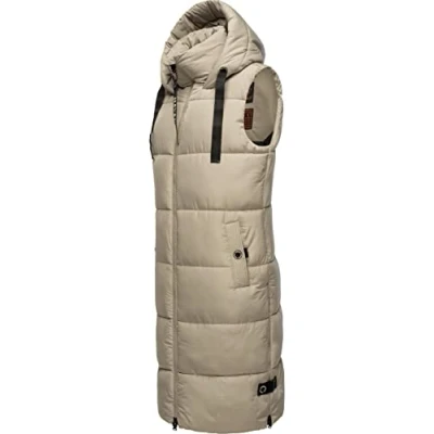 LOOK: Long, sleeveless women's long vest with large, width-adjustable hood from Navahoo. Properly combined, it is ideal for both the cold season (autumn and winter), but also for cool days in spring MATERIAL: Leisure vest (long vest) made from super soft, matte, shimmering outer material. The warm, soft padding guarantees a very comfortable feel and keeps you wonderfully warm in combination with the stand-up collar Fit: This warm outdoor vest is straight cut and therefore also allows a thick sweater underneath, the long vest has a top length up to the knees, but does not restrict freedom of movement thanks to side slits (with zip) DETAILS: Sleeveless quilted jacket with fashionable ribbons on the hood and numerous inner and outer pockets, which offer plenty of storage space for small valuables This stylish, long vest is ideal for sports activities, such as walking the dog, hiking or strolling around the city!