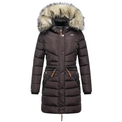 LOOK: Warm, quilted women's winter coat from Navahoo with cuddly soft faux fur on the hood (removable) - ideal for the cold season! (Autumn & Winter) Material: The jacket impresses with its robust yet soft outer material (water and wind repellent), the supple quilted inner lining base and the inner lining top lined with fluffy faux fur FIT: The slightly tailored cut and the perfect length up to the thighs flatter every figure, and, despite its warm padding, the coat does not look bulky DETAILS: The hood and the inner lining top are warmly lined with faux fur, the outer pockets are also lined (against cold hands), chin guard on the front zip The outdoor coat keeps you warm even on cold days in winter thanks to the warm lining - an absolute must for any wardrobe!