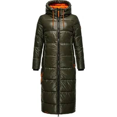 LOOK: Stylish, quilted winter coat from Navahoo in trendy metallic look with numerous contrasting details, such as the fleece-lined hood, which can be adjusted in width with cords MATERIAL: Shiny, water-repellent outer material in a modern metallic look, the soft inner lining and warm yet lightweight padding invite you to cuddle right in FIT: Outdoor coat with a great length up to approx. Reaching to the middle of the calves and comfortable, straight cut; for those who prefer a more snug fit: the waist can be adjusted in width with an internal drawstring DETAILS: The 4 lined zippered pockets (2 of them side chest pockets) and several inside pockets offer plenty of storage space, an inside-sewn shoulder strap allows it to be worn over the shoulder (e.g. when shopping) The thickly lined women's winter jacket is a real fashionable eye-catcher and also offers plenty of leg room thanks to side slits - a fashionable and practical highlight for the cold season (autumn and winter)
