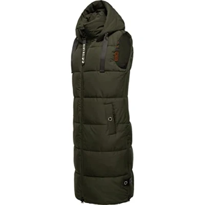 LOOK: Long, sleeveless women's long vest with large, width-adjustable hood from Navahoo - properly combined, it is ideal for both the cold season (autumn and winter), but also for cool days in spring MATERIAL: Leisure vest (long vest) made from super soft, matte, shimmering outer material. The warm, soft padding guarantees a very comfortable feel and keeps you wonderfully warm in combination with the stand-up collar Fit: This warm outdoor vest is straight cut and therefore also allows a thick sweater underneath, the long vest has a top length up to the knees, but does not restrict freedom of movement thanks to side slits (with zip) DETAILS: Sleeveless quilted jacket with fashionable ribbons on the hood and numerous inner and outer pockets, which offer plenty of storage space for small valuables This stylish, long vest is ideal for sports activities, such as walking the dog, hiking or strolling around the city!