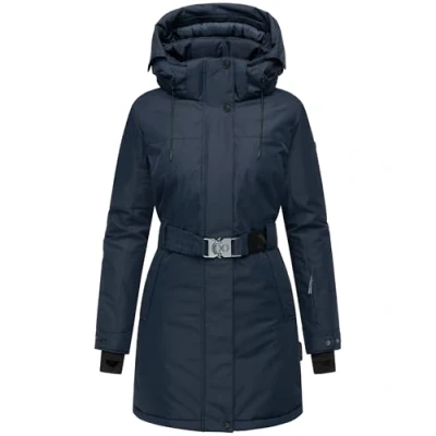 Look: modern winter coat with urban look that integrates stylishly into a wide range of city styles. The highlight of this jacket are the contrasting details, as well as the eye-catching waist belt and the removable hood. Material: the smooth, robust outer material reliably protects against wind. Inside a silky smooth quilted lining provides comfortable warmth. Ideal for cold days - a functional outdoor jacket that impresses with comfort and style. Fit: the long jacket (length up to approx. mid-thigh) has a figure-flattering cut, whereby the wide waist belt with distinctive buckle accentuates the silhouette and allows individual adjustment options for an even more tailored fit. Details: thanks to adjustable sleeve ends and elastic cuffs with thumb holes, no cold air penetrates the jacket. The two press stud pockets on the outside offer plenty of storage space in combination with 2 zip pockets inside. On top, the winter parka has a hidden chest pocket and a sleeve pocket. This warm coat combines comfort with feminine lines and striking details. Ideal as a winter coat for everyday use and leisure in cold temperatures in autumn and winter - functional, stylish and thoughtfully equipped.