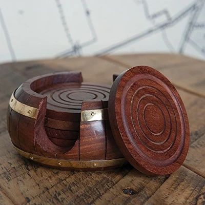 Six wooden coasters in a barrel, made from polished sheesham (a sustainable hardwood), with chunky solid Brass fastening. Height 2", diameter 5".… From Nauticalia, specialists in nautical gifts and accessories since 1974