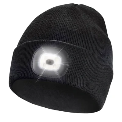 π‘βΊππ· HEADLIGHT BEANIE HAT - This versatile and practical accessory combines warmth and illumination in one. This brilliant design merges a cosy unisex beanie with a powerful headlamp, the built-in LED light allows you to focus on your activities without holding a torch and ensures you can take on any activity even on cold and dark nights! π‘βΊππ· ADJUSTABLE BRIGHTNESS SETTINGS - This innovative hat torch has been designed with 3 different brightness settings, 40, 60, and 120 lumens, so it is tailored to your every need. Illuminate your path when walking the dog or going on a late-night run, use it on a dark building site to finish your work for the day, or use it on a camping adventure to read by the campfire π‘βΊππ· GREAT BATTERY LIFE - This fantastic LED beanie hat provides great battery life from just two hours of USB charging! The hat can be used for up to 5 hours of continuous use on its maximum brightness setting and for even longer on the lower brightness settings. This means you're always ready for your next adventure or task without the hassle of worrying that your torch will run out of battery! π‘βΊππ· MACHINE WASHABLE - We have designed this hat to be machine washable so cleaning it is a hassle-free process. Should the headlamp hat get dirty in the course of your adventures with it, simply remove the LED lights contained in this hat by pulling the rim of the hat open and pushing the light out. Once the light is safely disconnected you can easily clean the hat in a washing machine or by hand π‘βΊππ· INCLUDED IN THIS PACKAGE - In each package, you will receive a rechargeable headlight beanie hat. The hat has three brightness settings and is perfect for a wide variety of purposes. It can be used by runners, walkers, tradesmen, campers and much, much more. The hand contains 4 LED SMD (surface-mounted device) with 3 brightness settings, the light is USB rechargeable and machine washable. Each hat measures approximately 21 x 19cm (8.26 x 7.48")