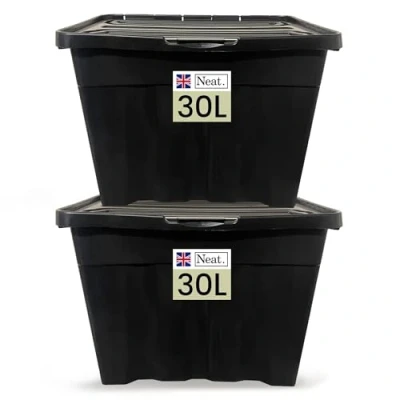 Neat. 30L Storage Boxes with Lids Black Base & Hinged Lid Ideal for Home Organisation, Durable Plastic Containers, Space Saving Box Solutions, Easy Access, Pack of 2