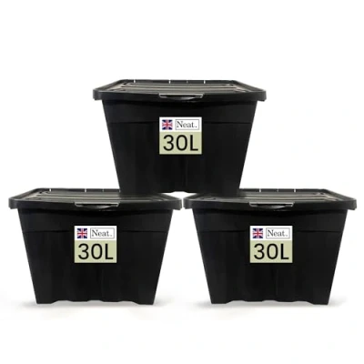Neat. 30L Storage Boxes with Lids Black Base & Hinged Lid Ideal for Home Organisation, Durable Plastic Containers, Space Saving Box Solutions, Easy Access, Pack of 3