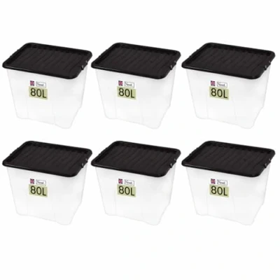 Neat. Plastics Large Plastic Storage Box With Black Clip On Lids, Durable & Stackable Organizing Container For Home, Garage Office, Set of 6