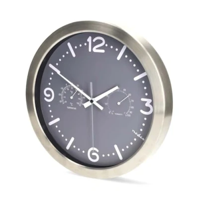 NEDIS Analogue Wall Clock, Silent Non Ticking Quartz Movement with Thermometer and Hygrometer, Stainless Steel Frame for Office Home, 30cm Silver/Grey