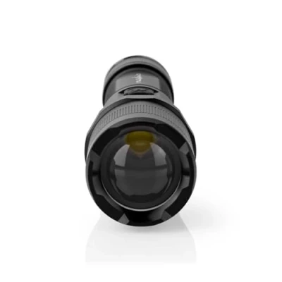 POWERFUL ADJUSTABLE BEAM - Rechargeable Nedis LED torch with focus beam from small spot to wide high beam delivering up to 1000 lumens and 110 metres range for versatile lighting ROBUST ALUMINIUM ALLOY HOUSING - Durable metal body with hidden in-body USB-C port allows convenient charging of included 18650 Li-ion battery for reliable outdoor use INTUITIVE DUAL SWITCH CONTROL - Large tact switch for on/off and small tact switch to toggle brightness levels (100%, 40%, 10%) plus strobe function for emergency signalling WATER RESISTANT IPX4 RATING - Protected against splashing water from any angle making it ideal for camping, fishing, and outdoor adventures in varied weather LONG LASTING RECHARGEABLE BATTERY - Integrated 3.7 V / 2.2 Ah lithium-ion battery supports up to 4 hours burn time with power indicator showing battery status via 4 blue LEDs
