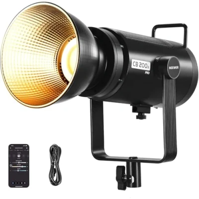 【Powerful 210W Continuous Lighting】210W COB LED continuous studio light provides maximum illumination of 90000Lux/1m and stable two-tone lighting for video recording, wedding, live streaming, podcast, portrait, and product photography. The brightness can be adjusted from 0% to 100%, and the color temperature range is between 2700K and 6500K. CRI/TLCI 97+ ensures accurate color reproduction that helps you take vivid and attractive photos and videos. 【12 Scene Effects/Booster Mode/Quiet】12 preset scene effects to add eye-catching elements to your video creation. Supports one-button booster mode, which provides about 210W of power and 90000Lux/1m, automatically turning on the fan for heat dissipation. Silent mode provides about 60W of power and 30000Lux/1m, where the fan will remain off, photo light suitable for photo shoots and kids/pets shooting 【Infinity and 2.4G App Control】 The NEEWER app configured with NEEWER Infinity connection technology allows dynamic adjustment of multiple lights settings simultaneously within 66'/20m. Compatible with NEEWER SL90, RGB1, RGB C80, RGB 1200, MS60C, MC60B, BH30S and CB60B, all equipped with built-in 2.4G technology and 99 channels. Set them on the same channel to control them remotely within 328'/100 simultaneously 【Ultra Quiet Fan & Overheating Protection】Built-in ultra-quiet fan and upgraded heat dissipation mechanism, plus an aluminum construction shell to provide creators with a highly quiet and safe shooting lighting environment for video productions. LCD panel shows readable readings on brightness, channel number and real-time operating temperature. A protective cover protects the LED from scratches 【Universal Bowens Attachment and Standard Reflector】 Bowens attachment protects light modifiers such as reflectors, softboxes and beauty dish. The standard reflector with silver interior ensures even distribution and a translucent diffuser allows for a soft light source. The U-bracket tilts 360° and fits most light stands as an essential item for content creators and influencers. A socket under the light can mount photo umbrellas