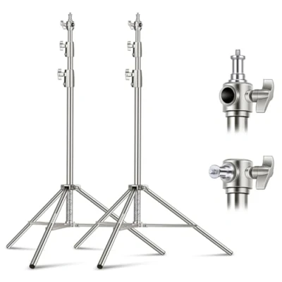 【Heavy Duty Light Stand】 Made of stainless steel, the rust resistant photography lighting tripod is designed for rugged use, supporting LED video lights, ring lights, monolights, strobes, softboxes, reflectors, and other equipment up to 22lb/10kg 【Spring Cushioned for Protection】 With built in spring cushion to protect your lighting & studio equipment from sudden drops, the ST-280SS is an ideal content creator essential/influencer must have for professional shots, portrait photos & video recording 【4.1'- 9.2' Adjustable Height】 The telescopic light stand with 3 sections offers a broad height range of 4.1'- 9.2' for overhead & lower angle shooting. The sections lock securely with metal knobs to prevent sudden movement or shocks 【1/4" to 3/8" Adapter】 With a 1/4"-3/8" reversible screw adapter, the ST-280SS works with a wide range of photography accessories & light fixtures. Also features a 3 way mounting interface, positioning your equipment vertically or horizontally as needed 【Foldable & Portable】 This photography light stand folds down to a compact 3.4' for easy storage and transport. Sandbags (sold separately) can be placed on the legs for added stability
