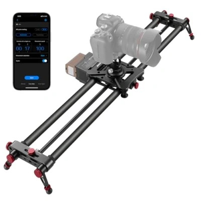 【Versatile & Smooth Camera Slider】 This 31.5"/80cm long remote camera slider automatically moves your camera back and forth for professional video shooting. Ideal camera accessories & content creator essentials/influencer must haves for photography. The max load is 11lb horizontally and 5.5lb when tilting up 45°. Note: Minor shake may occur when using slider for macro photography 【Smart Two Way Control】The camera slider video maker supports APP and 2.4G remote control (not included), offering manual, video, and time lapse modes. Easily set speed, interval, and exposure for smooth and precise motion, making it ideal for creative shots, product videos, and time lapse photography. 【Silent Motor & Long Battery Life】The electric camera slider mount features a silent stepper motor for smooth, quiet camera movement. Powered by the included 4400mAh NP-F750 battery or a 5V 2A Type C portable charger (NOT included), it lets you film continuously for hours 【Multiple Shooting Angles】Adjust the side knobs for creative shots—set opposite angles for tracking or 120° panoramas, or keep them centered for horizontal shots. The slider also supports 45° tilt and 90° vertical shooting for versatile camera movement 【Lightweight & Built to Last】The carbon fiber build of this camera dolly ensures a rugged and stable structure while making the motorized video slider lightweight for outdoor photography. The 4 roller bearings provide extra balance and anti shake effects. With 1/4” and 3/8” threaded holes for mounting on tripods