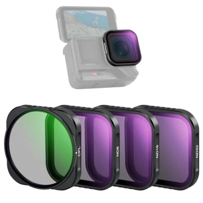 【For Ace Pro and Ace Pro 2】 Compatible with Insta360 Ace Pro Insta 360 Ace Pro 2, this lens filter set offers an adjustable CPL (circular polarizing) and three ND (neutral density) filters (ND8, ND16, ND32). Ideal for POV shots of hiking, biking, skiing, skateboarding, skydiving, and other sports as content creator essential photography accessories and influencer must have action camera gear 【Flexible Exposure Control】 Three neutral density filters reduce light by 3, 4, and 5 stops, respectively. They help avoid overexposure across different light conditions and allow you to capture rivers, waterfalls, and light trails with dynamic motion blur 【Minimal Glare, Rich Color】 Rotate the circular polarizer filter to eliminate reflections from water, glass, and other nonmetallic surfaces while enhancing contrast and saturation for a more vibrant color rendition 【Multicoated Optical Glass】 The premium optical glass with multiple resistant coatings ensures sharp imaging while withstanding water, fingerprints, and scratches during everyday use. A cleaning cloth is included for upkeep 【Fast Snap On Attachment】 Each filter can directly snap onto the camera lens and stay firmly in place with the inner rubber seal. Note: Filters are not for underwater use, as water will enter and degrade the image quality