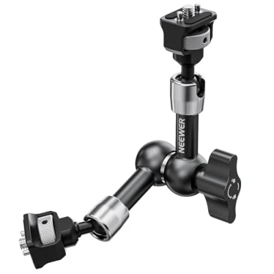 【Flexible & Stable Articulating Magic Arm】 Featuring two articulated arms connected by a 360° friction gear joint, this 7"/18cm rosette magic arm camera mount with dual ball heads offers versatile positioning for DSLR mirrorless cameras, LED video light panels, microphones, field monitors (compatible with Atomos Ninja V), phone holders, action camera adapters, etc., and connects them to camera cages, camera tripods, or other camera rigs using a super clamp (not included). Max Load 4.4lb/2kg 【360° Dual Ball Head for Versatile Angles】 Each articulating arm features a ball head with a U notch for 360° rotation and 90° tilt adjustments, and can be secured at any desired angle using the enlarged lever, ensuring stability and precise positioning 【Secure Mounting with Locating Pins for ARRI standard】 The 1/4" mounting screws with anti twist retractable locating pins for ARRI standard and nonslip silicone pads prevent wobbling or vibration while in use. The thumbscrews can be tightened by hand for no tool required setup 【Improved Locking System & Smooth Adjustment】 The upgraded locking structure at the gear joint of the camera arm is built with thrust ball bearings for smooth and efficient rotation. The enlarged ergonomic lever ensures precise torque, enabling rapid locking of arms within one second, saving both time and effort 【Sturdy Build】 Crafted from aluminum alloy and stainless steel, this articulating friction arm is robust enough to support and secure your camera monitors, and tough enough to withstand frequent use and daily scratches. Versatile as a camera phone mount, camera monitor mount, action camera mount, or webcam arm for photography and videography