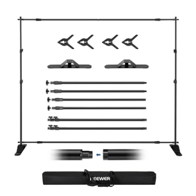 【Ultra Stable Photography Background Support System】 Crafted from premium aluminum alloy, this 10 x 8ft / 3.1 x 2.4m backdrop stand features two widened metal bases for unmatched stability up to 11lb/5kg. Also comes with cross bars and retractable extension poles for more flexible backdrop sizes and compositions, and can be packed in the carrying bag for easy storage and transport 【Customizable Height & Width】 With four detachable crossbars (two upper, two lower) and two telescopic extension poles, this adjustable backdrop stand easily adjust width from 5.9ft/180cm to 9.8ft/300cm by adding or removing crossbars, and set at your preferred height from 3.2ft/98cm to 8ft/245cm with a simple twist 【Effortless Assembly】 Simply twist to assemble all crossbars and telescopic extension poles, and adjust and fasten bare hand to your desired dimensions. No extra tools required and setup in minutes 【Reinforced Backdrop Clamps】 Four reinforced spring clips for backdrop stand secure polyester/muslin backdrops, seamless paper, and canvas in place. The 2"/5cm jaw opening and pivoting pads hold backdrops of various thicknesses 【Versatile Uses】 Can be used as a curtain stand, photography background stand, a banner stand, or photo studio backdrops stand, perfect for portraits, birthday parties, weddings, holiday celebration, exhibitions, etc.