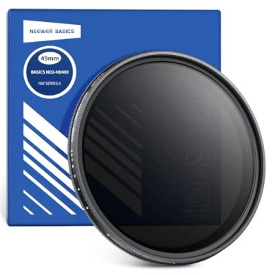 【Introducing NEEWER BASICS】 Simple and practical, NEEWER BASICS is an economical product line that focuses on essential functions and designs, without unnecessary extras and materials 【Flexible Light Reduction】 This variable ND2-400 filter reduces light by 1-9 stops. It can avoid overexposure across a variety of weather conditions and allows you to capture motion blur effects by using slow shutter speeds and wide apertures. Simply rotate the frame to exact marks for precise exposure control 【Anti Fingerprint Coatings】 Multiple anti fingerprint coatings are resistant to water, dust, fingerprints, and smudges during outdoor shooting. A cleaning cloth is included for daily maintenance. Ideal as content creator essential digital camera accessories and influencer must have photography gear 【Knurled Ultra Slim Frame】 The slim aluminum alloy frame can prevent vignetting on wide angle lenses while CNC machined knurling ensures smooth installation and removal. It only suits lenses with a 49mm filter thread and 52mm lens caps/hoods 【Removing the X Pattern】 A dark X pattern (or X vignetting) may appear at the max ND value. This is common when the variable ND filter, with its two polarizing filters aligned at a specific angle, interacts with certain lenses and focal lengths. To fix it, reduce ND values