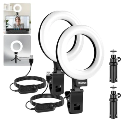 【Introducing NEEWER BASICS】 Simple and practical, NEEWER BASICS is an economical product line that focuses on essential functions and designs, without unnecessary extras and materials. 【2 Pack LED Fill Light Kit】 NEEWER BR60 ring light for desk with 60 LEDs offers 450Lx illuminance at 0.5m, 3000K-6000K color temperature, CRI>97. Clip the ring light onto a laptop, computer camera, webcam, desktop display, or monitor with thickness under 1"/2.5cm. Use with the mini desk/table tripod for makeup, selfie, Tiktok/Youtube social media video recording, podcast, Facetime, Zoom call, home office meeting, video conferencing, live stream, vlogging, videography, studio photoshoot 【Multiple Lighting Options】 Press the mode switch button to cycle through warm, mixed warm, mixed, mixed cool, and cool white modes. The mini LED halo ring light, paired with the compact tripod stand, provides soft lighting with a 10 level dimming function, allowing seamless brightness adjustment from 10% to 100%, satisfying the shooting requirements as content creator essential and influencer must have for streamers, makeup artists, photography professional players or enthusiasts 【USB Powered LED Selfie Light】 The 10W LED ring film light operates at 5V/2A, with a built in 6ft/1.8m charging cable, conveniently powered by such as displays, laptops, portable chargers, or other USB power sources, offering an energy efficient solution for photography and everyday lighting. Note: When attaching the clip to your device, ensure the hole on the clip faces the camera lens to avoid obstructing the view 【Adjustable & Flexible Accessories Kit】 The LED ring light with clip for computer camera (not recommended for use on smartphones) offers 170° tilt. Mounted on the mini desk tripod stand, the small portable circle ringlight provides 360° pan, 135° tilt rotation, and an elevated height of 9cm, providing flexible desktop lighting as a key or fill light or handheld for iPhone iPad selfie photos, travel vlogging, filming, cell phone photography, video recording, etc