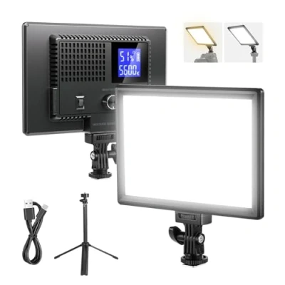【Introducing NEEWER BASICS】 Simple and practical, NEEWER BASICS is an economical product line that focuses on essential functions and designs, without unnecessary extras and materials. 【10W High CRI LED Panel Light】 The 9" LED video key light features 120 high performance LEDs (60 warm & 60 cool) with edge lit technology, delivering bright, eye caring lighting up to 800lux/0.5m. It offers a high CRI of 95+ for true to life color accuracy, ensuring natural skin tones without distortion, perfect for selfies, makeup tutorials, and professional video work. Note: Carry Bag is NOT included 【Bi Color Lighting with Stepless Dimming】 This LED NL-120Bl panel continuous light allows for precise adjustment of color temperature from 3200k to 5600k and brightness from 0% to 100% in 1% increments. Ideal as social media content creator essential, streamer and influencer must have gear kit for YouTube/TikTok films, vlogging, product photos, food photography, filming, desk/table Zoom calls, makeup artists, selfies, live streams, portraits, studio photoshoots, podcast video recording 【Extended Battery Life & Convenient Charging】 Equipped with a built in 3.7V 4000mAh lithium battery, the portable LED photography light offers 1.5 hours lighting runtime. Fully charged in just 2 hours, supporting both Type C and USB ports charging. A USB Type C charging cable is included for added convenience. NOTE: For optimal battery longevity, please fully charge the device before first use 【Mini Tripod with Cold Shoe Adapter】 Includes a sturdy all metal desktop stand that extends up to 7.1"/18 cm, providing stable support for tabletop shooting. With a 1/4" cold shoe adapter, the fill light equipment of this photography and videography lighting accessories kit can be attached to the top of DSLR or camcorders for studio photos and videos, compatible with Canon Nikon Sony Fujifilm fuji mirrorless digital cameras, and allows for 180° front and back tilt for your desired angles
