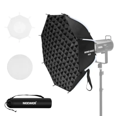 【Introducing NEEWER BASICS】 Simple and practical, NEEWER BASICS is an economical product line that focuses on essential functions and designs, without unnecessary extras and materials 【Premium Octagonal Softbox】 Elevate your portrait photos, weddings, fashion photography, studio camera photoshoot, filming, video recording, live streaming, and interviews with this 25.6"/65cm essential octagonal softbox. Silver interiors intensify light source while maintaining true color. The kit includes diffusers and a grid to soften glare and eliminate shadows. A lightweight (2.6lb/1.17kg) nylon alloy chuck structure and a soft box lighting equipment set carrying bag for outdoor portability 【Quick Release & 8 Resilient Ribs】 The softbox features an integrated structure for instant opening and closing in seconds, providing seamless lighting control while saving time and effort. Besides, 8 resilient ribs are designed to endure years of use without distortion, and easily collapse for storage in the included carrying bag 【Honeycomb Grid & Diffusers】 The honeycomb grid can make the light shape confined and directional, giving a dramatic and expressive light effect to define the model’s facial structure. Two quality diffusers can be combined or used separately for different effects 【Standard Bowens Mount】 With the standard Bowens mount, this photography softbox can attach to numerous NEEWER monolights and LED continuous video lights and strobe flash monolights, such as CB60, CB100, CB150, CB60B, RGB CB60, CB200B, MS60B, MS60C, MS150B, S101-300W/400W Pro, Vision 4, Q4. Compatible with SmallRig compatible with Aputure 120d Godox sl60w, etc., as content creator essential photography videography accessories and influencer must have film lighting gear
